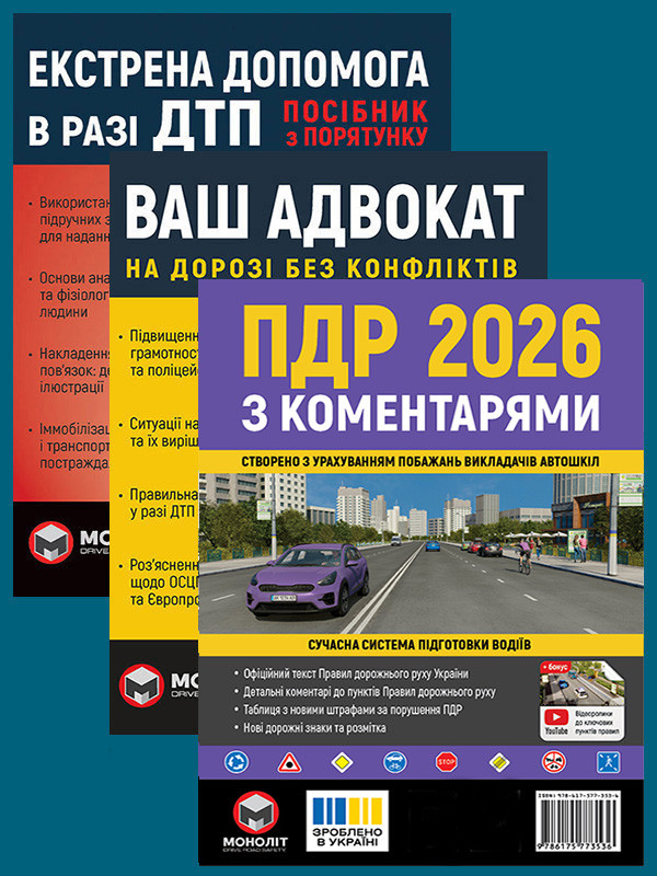 Комплект Правила дорожнього руху України 2026 (ПДР 2026) з коментарями + Ваш адвокат. На дорозі без конфліктів + Екстрена допомога в разі ДТП