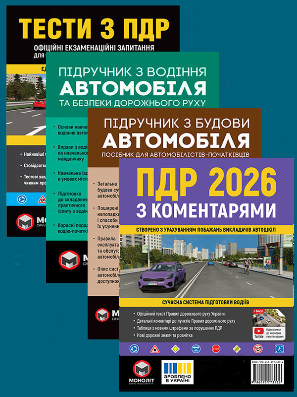 Комплект Правила дорожнього руху України 2026 (ПДР 2026) з коментарями + Тести ПДР + Підручник з водіння автомобіля + Підручник з будови автомобіля