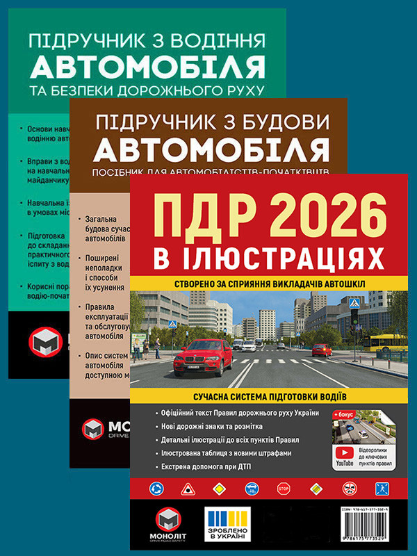Комплект Правила дорожнього руху України 2026 (ПДР 2026) з ілюстраціями + Підручник з водіння автомобіля + Підручник з будови автомобіля