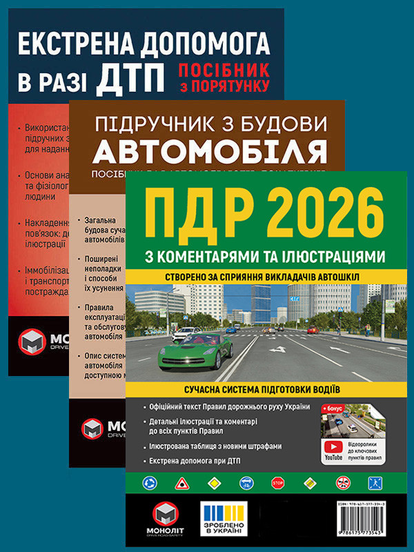 Комплект Правила дорожнього руху України 2026 (ПДР 2026) з коментарями та ілюстраціями + Підручник з будови автомобіля + Екстрена допомога в разі ДТП