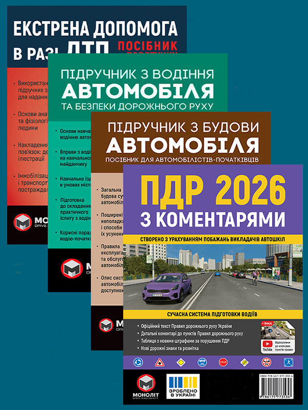 Комплект Правила дорожнього руху України 2026 (ПДР 2026) з коментарями + Підручник з водіння автомобіля + Підручник з будови автомобіля + Екстрена допомога в разі ДТП